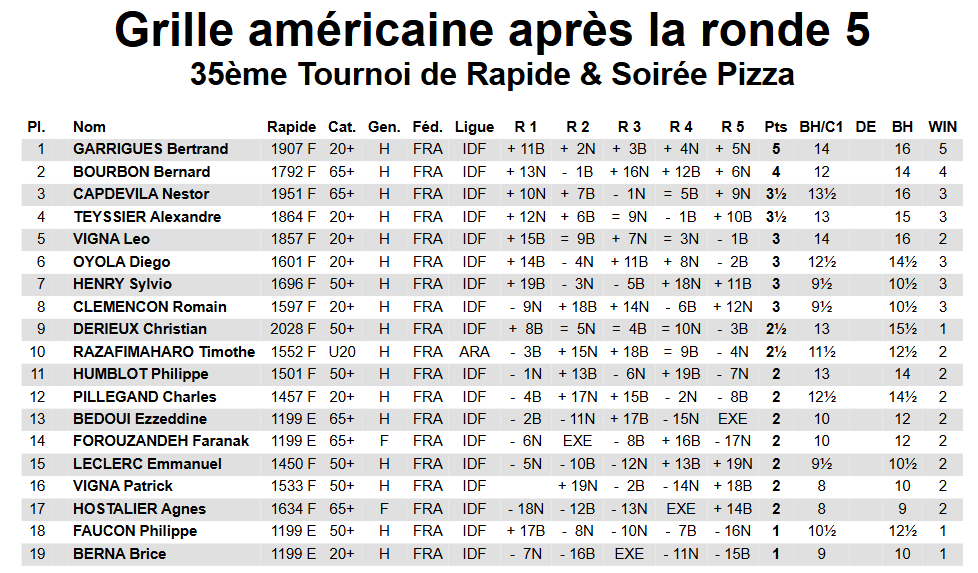Les 5 rondes à la cadence de 12mn + 3s/cp avec 19 participants, se sont enchaînées jusqu'à 22h45.